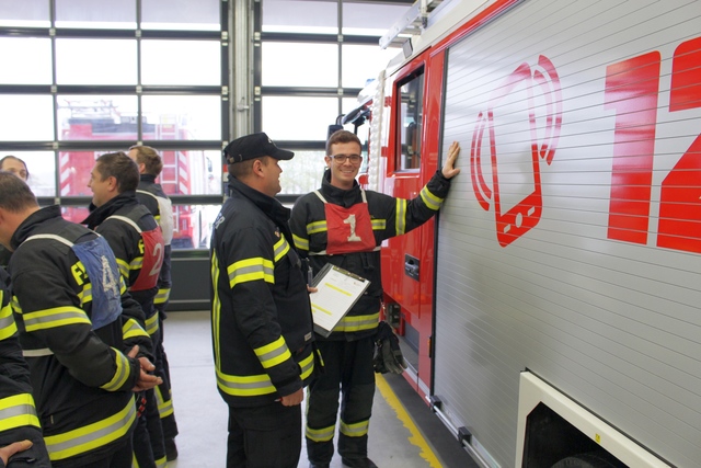 Danach folgt die praktische Abarbeitung eines Löschangriffs. Aus den drei möglichen Szenarien wurde von der Gruppe Löschzug 4 ein Holzstapelbrand gezogen, der mittels eines B-Rohres bekämpft werden musste. Auch hier konnten die Bewerber die in der kurzen aber intensiven Vorbereitungsphase gefestigten Kenntnisse gut umsetzen.